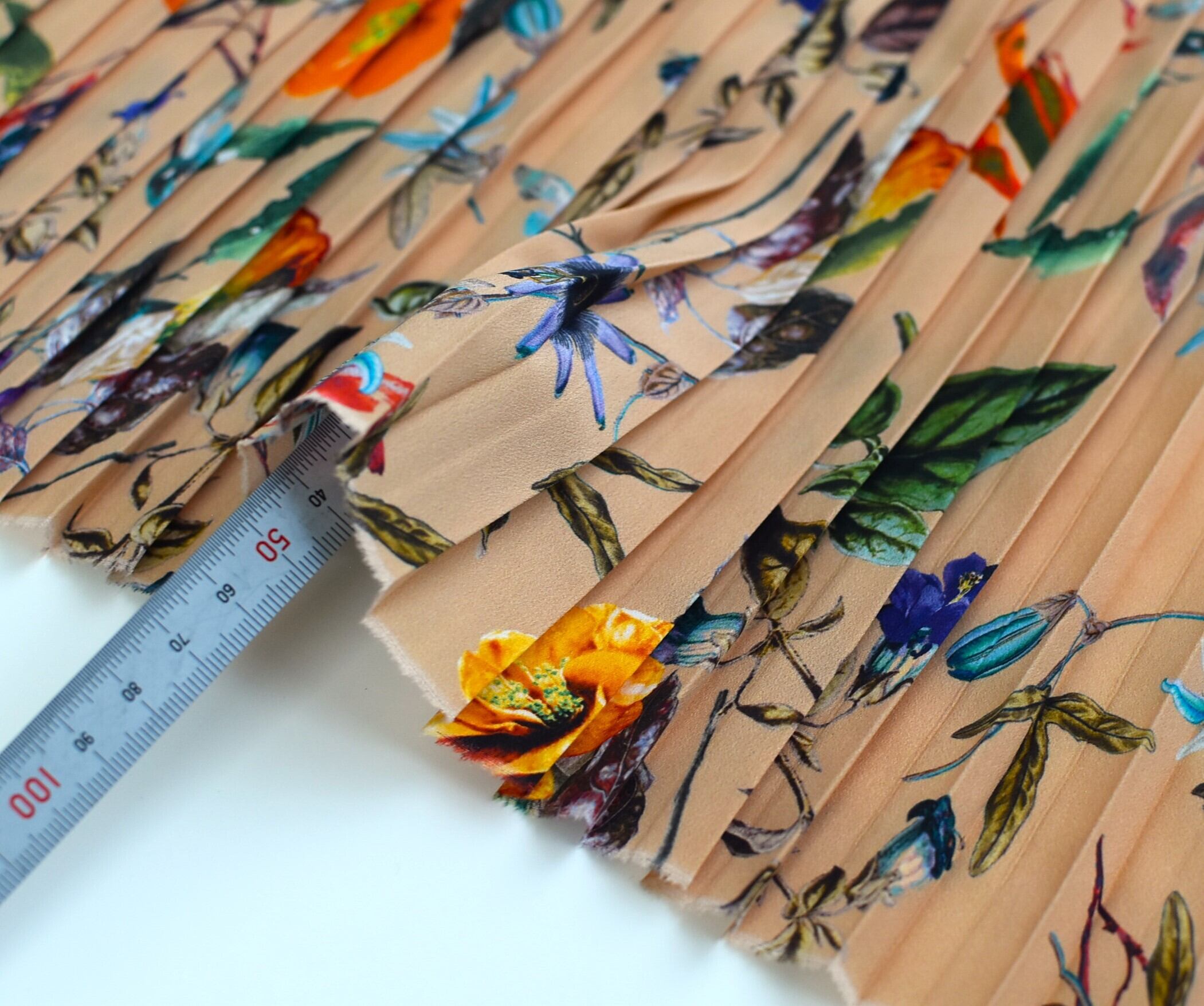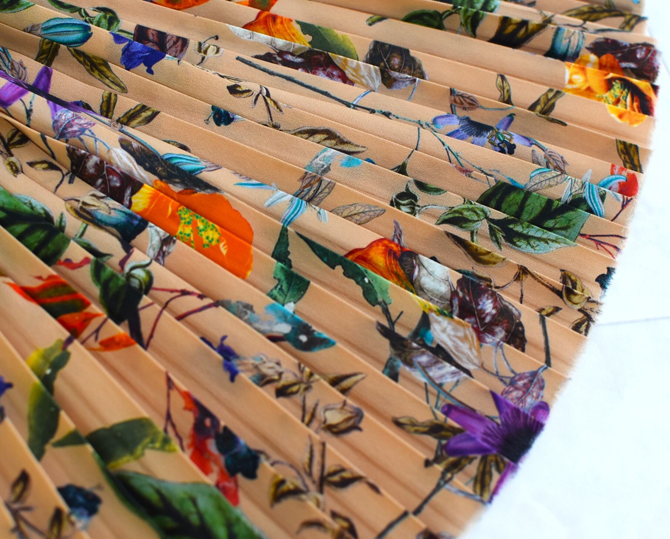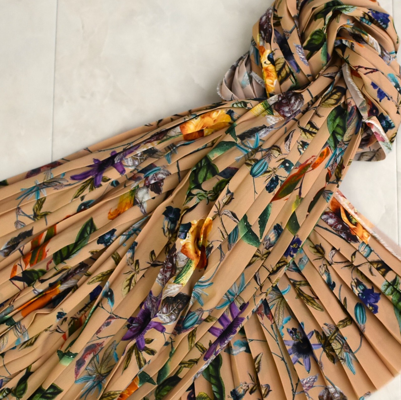 プリーツによって一つ一つの植物のディティールが隣り合い、柄の面白さが増しています