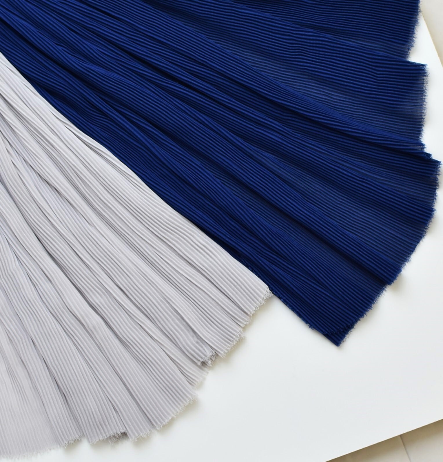 爽やかな色味とシフォンの透け感とプリーツの規則性が合わさり軽やかな商品です。